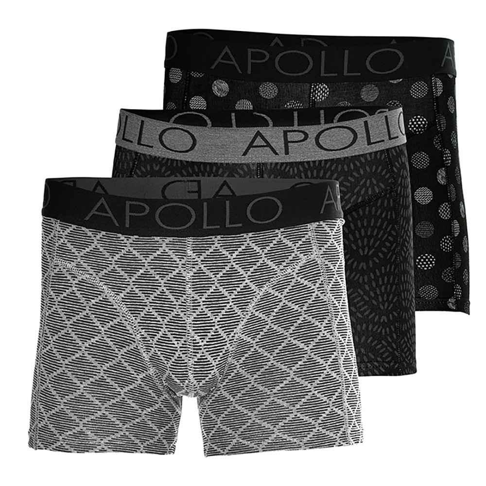 Merk: Apollo Inhoud: 3 boxershorts Kleur: Zwart en Grijs met print Materiaal: 95% katoen, 5% elastaan Maten: S t/m XXL