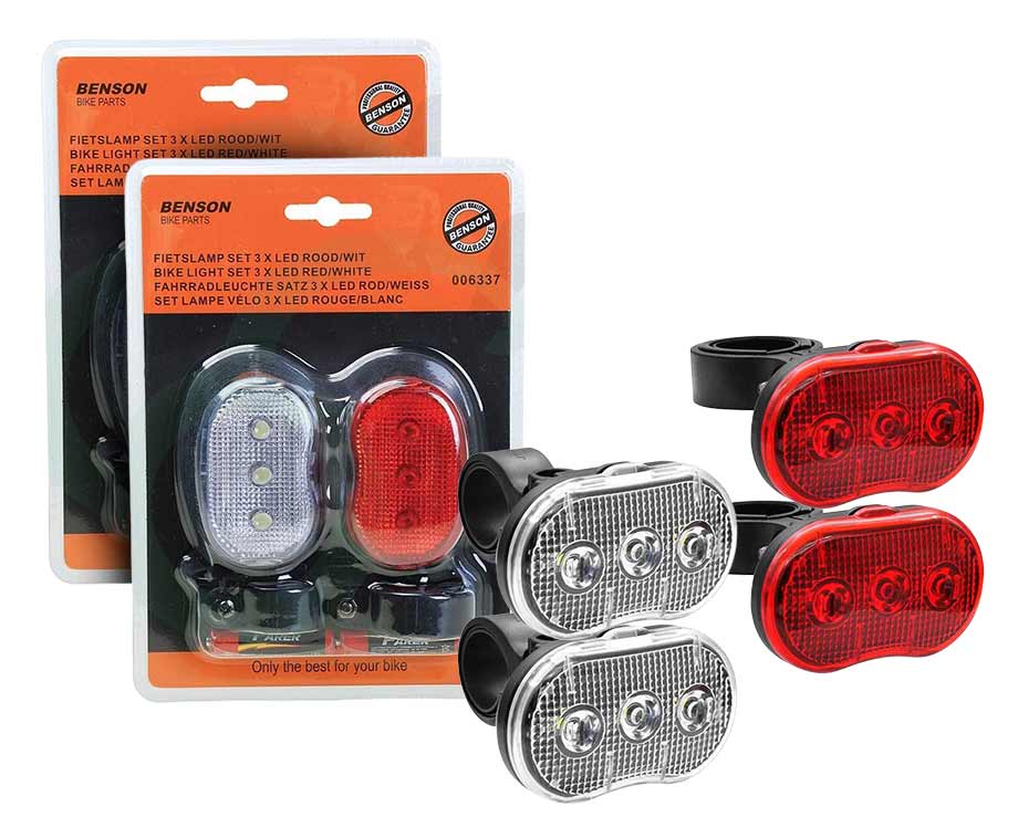 De set bestaat uit een voor- en achterlicht met 3 LED-lampjes. Deze zijn eenvoudig aan elke fiets vast te maken met het meegeleverde bevestigingsmateriaal. Daarnaast kun je de lampjes gemakkelijk van de fiets halen door het handige kliksysteem. Bij de set worden ook standaard 2 x 2 AAA-batterijen geleverd.
