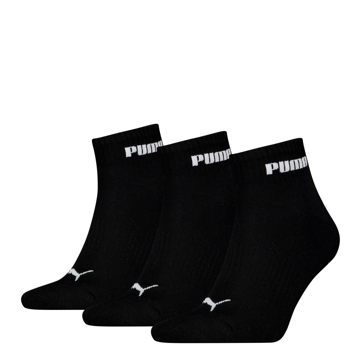 Merk:Puma Inhoud:3 paar quartersokken cushioned Kleur:Zwart Materiaal:77% Katoen, 14% Polyester, 7% Polyamide, 2% Elastaan Maten: 35/38, 39/42 & 43/46