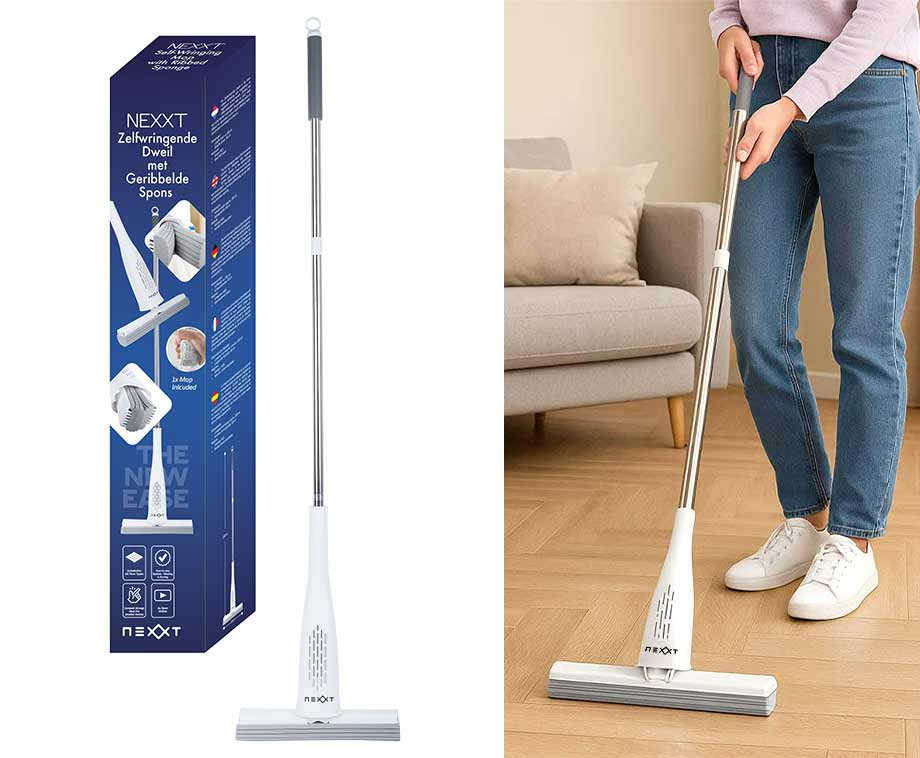 Geen vieze handen meerDankzij het slimme squeeze-systeem hoef je nooit meer te wringen met je handen. De mop doet al het werk voor je en neemt vuil, stof en water in één keer mee. Jij houdt droge handen en een streeploos resultaat.