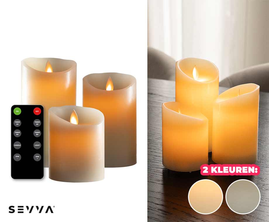 Set van 3 verschillende kaarsenDe drie SEVVA® opplaadbare kaarsen hebben alle drie een andere hoogte: 10cm, 12cm en 15cm. Dit geeft een gezellige en ontspannen sfeer. De kaarsen passen perfect in de kerstperiode, maar zijn net goed te gebruiken in de zomer of lente op het terras of in de tuin. Hét voordeel van deze SEVVA® kaarsenset is dat de drie kaarsen op te laden zijn met de meegeleverde usb-kabel. Je hoeft dus geen batterijen meer te vervangen.