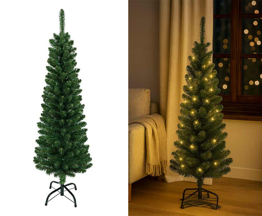 Deze kerstboom is hét antwoord voor wie sfeer wil creëren zonder veel ruimte kwijt te zijn. Met zijn elegante slanke vorm van 120 cm hoog past hij moeiteloos in elk appartement, studeerkamer of knusse woonkamerhoek.