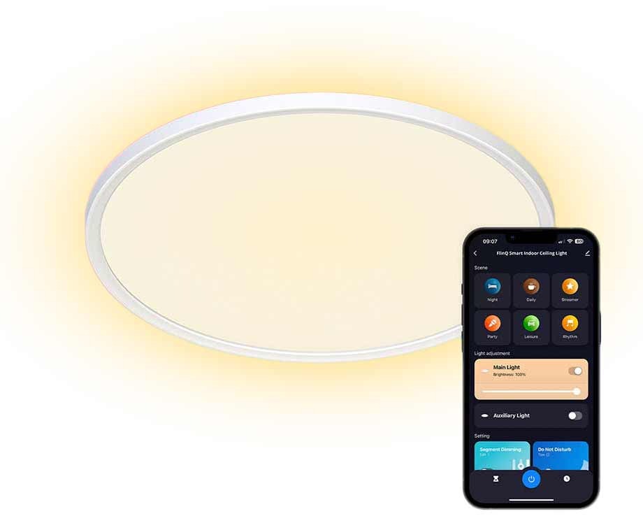 Met de FlinQ Smart Plafondlamp haal je meer dan alleen licht in huis. Of het nu gaat om helder wit licht voor een productieve werkdag of kleurrijke vibes voor een feestje – deze lamp past zich moeiteloos aan jouw stemming en stijl aan. Bediening? Simpel, via de FlinQ app. Installeer de lamp in een handomdraai en creëer direct de sfeer die jij wilt.