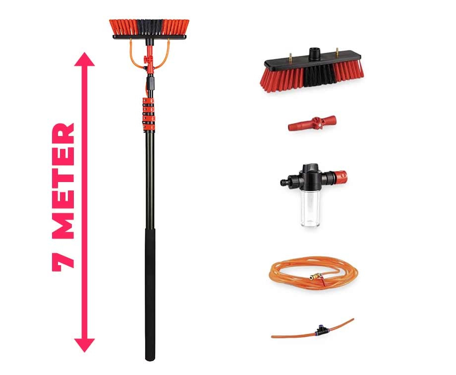 Robuuste borstelharenSchoonmaken op hoogte was nog nooit zo makkelijk geweest. Deze uitschuifbare waterborstel bestaat uit 4 delen die je maximaal tot 7M kan schuiven. Heb je groene aanslag op de muren of padden door het weer? Dankzij de robuuste borstelharen is het reinigen van deze oppervlaktes zo gepiept.