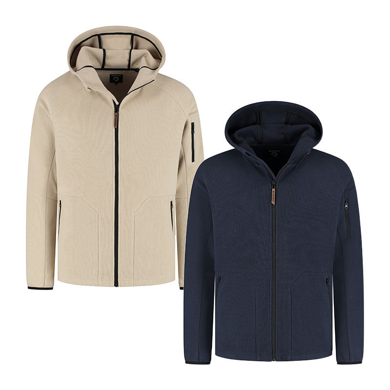 Travelin’ Herenvest Bjorn in marineblauw en zand. Comfortabel, stijlvol en praktisch met ritszakken en capuchon. Verkrijgbaar in maat M t/m 3XL!