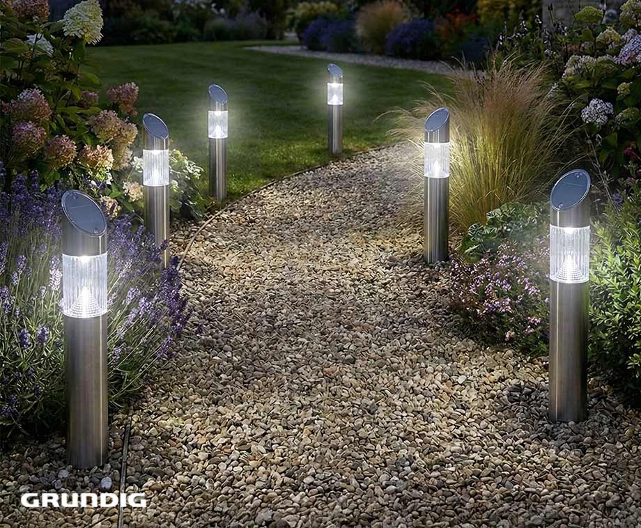 De behuizing van roestvrij staal geeft de lampen een moderne uitstraling en is bestand tegen weer en wind. De decoratieve kunststof lampinzet verspreidt een helder koud wit licht dat zorgt voor een strak en verzorgd effect in de tuin.