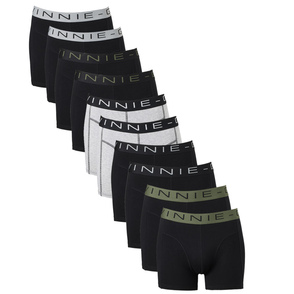Merk: Vinnie-G Inhoud:10 boxershorts Materiaal: 95% Katoen, 5% Elastaan Kleur: Black / Forest Green / Grey Maten: S t/m XXL Comfortabele pasvorm Platte naden en geen labels Ademend vermogen