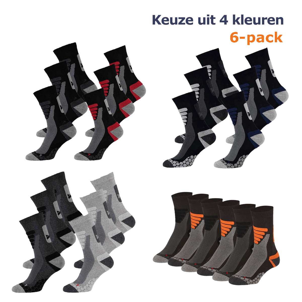 Merk: Xtreme Sockswear Inhoud: 6 paar wandelsokken Maten: 35/38, 39/42, 42/45 & 45/47 Materiaal: 45% katoen, 35% coolmax, 18% polyamide, 2% elastaan Kleur: Black, Grey, Green of Blue