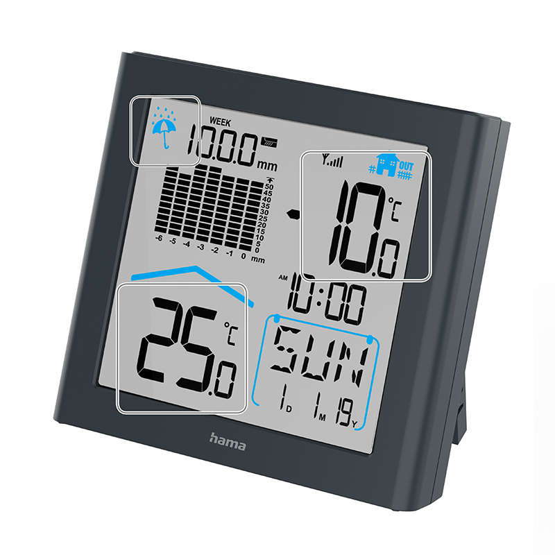 Met het Hama Rainy Radioweerstation blijf je niet alleen op de hoogte van de binnen- en buitentemperatuur, maar ontvang je ook waarschuwingen voor regen.