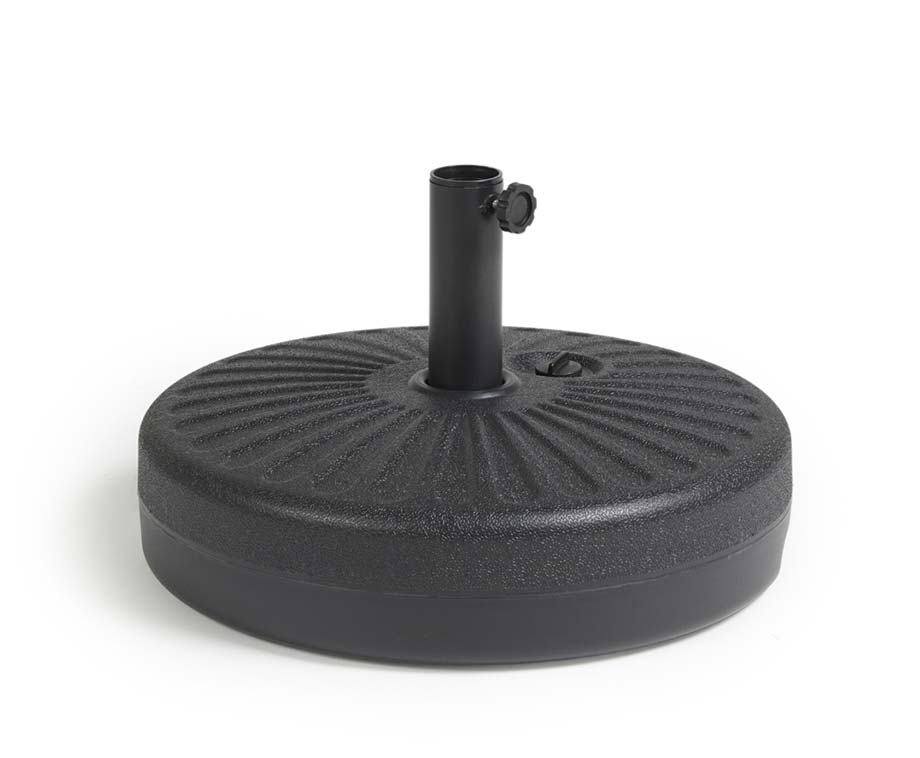 Je maakt de parasol vast door hem in de voet te draaien. Deze XXL parasolvoet kan worden gevuld met zand of water tot een gewicht van 22 kilo. Hij heeft een diameter van 51 cm en is te verkrijgen in de kleur zwart.